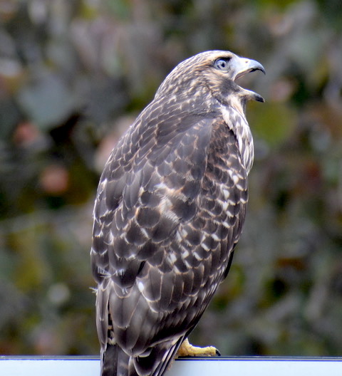 Many birds have been observed in the yard this year. Photographs clockwise from left: Female Red-bellied woodpecker and fledgling, bluebird, juvenile Ruby-throated hummingbird, goldfinch, White-breasted nuthatch, male bluebird with beetle and Red-tailed hawks.