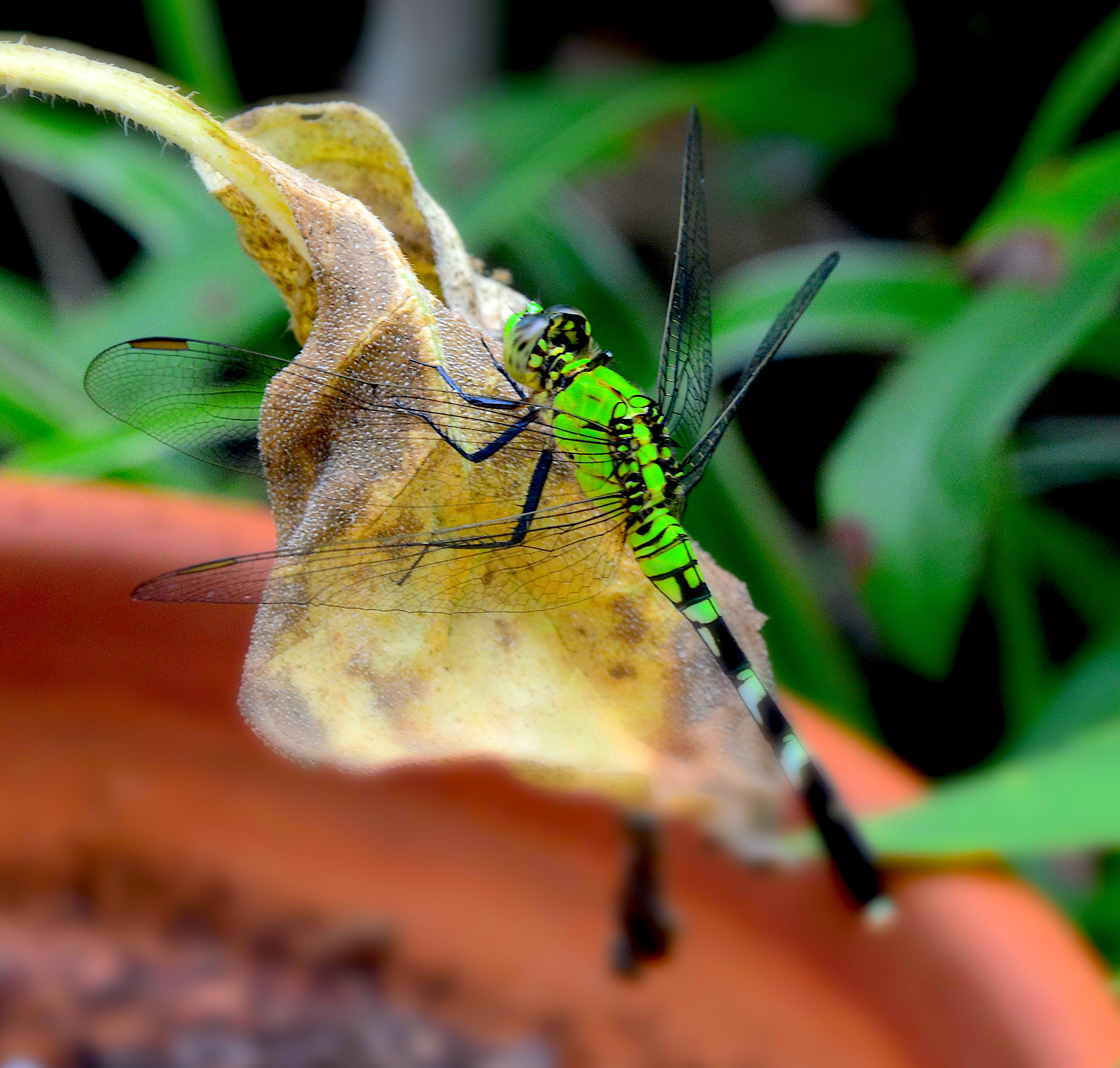 Photographs from left: Bumble bee on purple passionflower (Passiflora incarnata) and dragonfly on dead milkweed leaf.