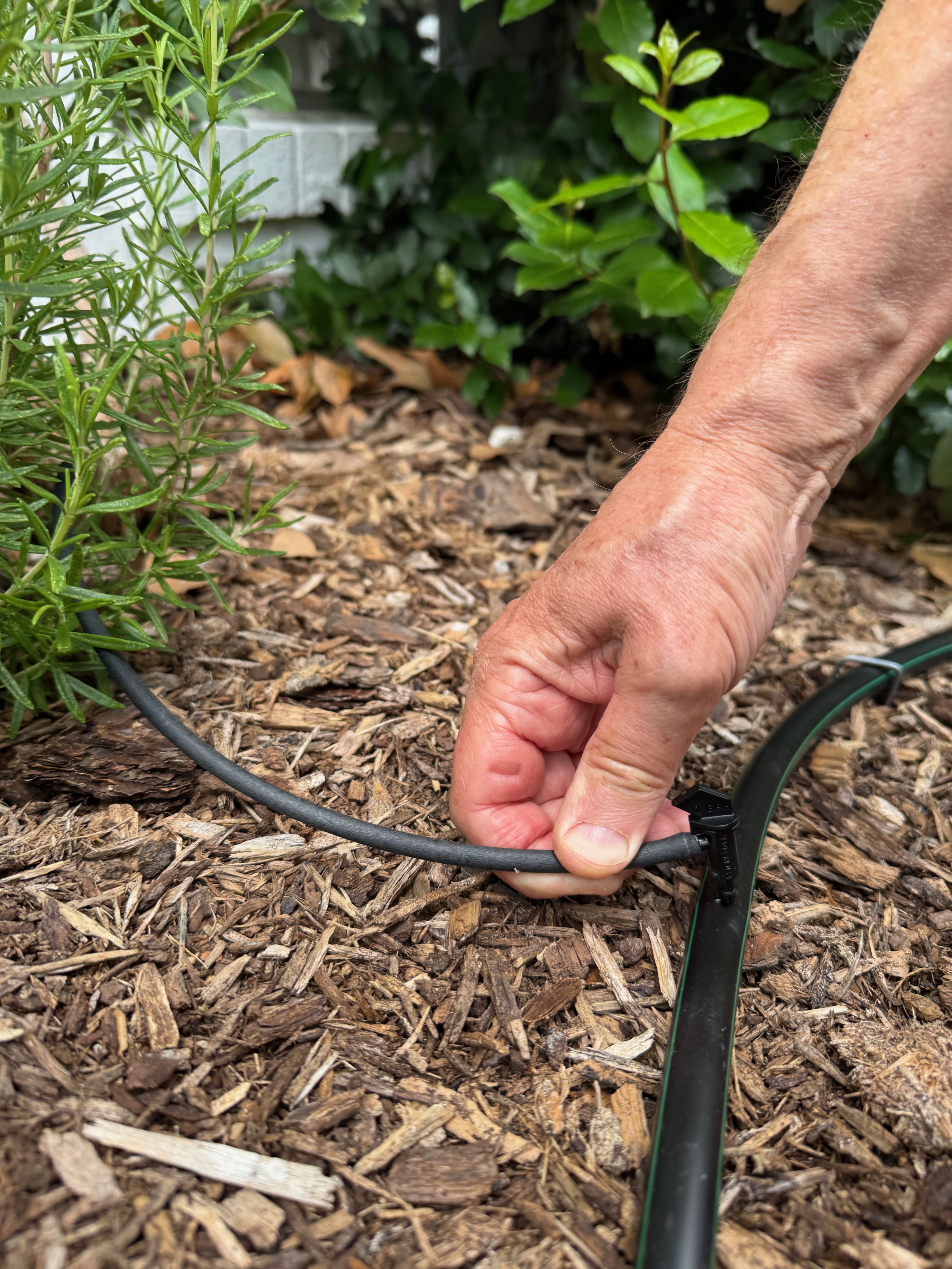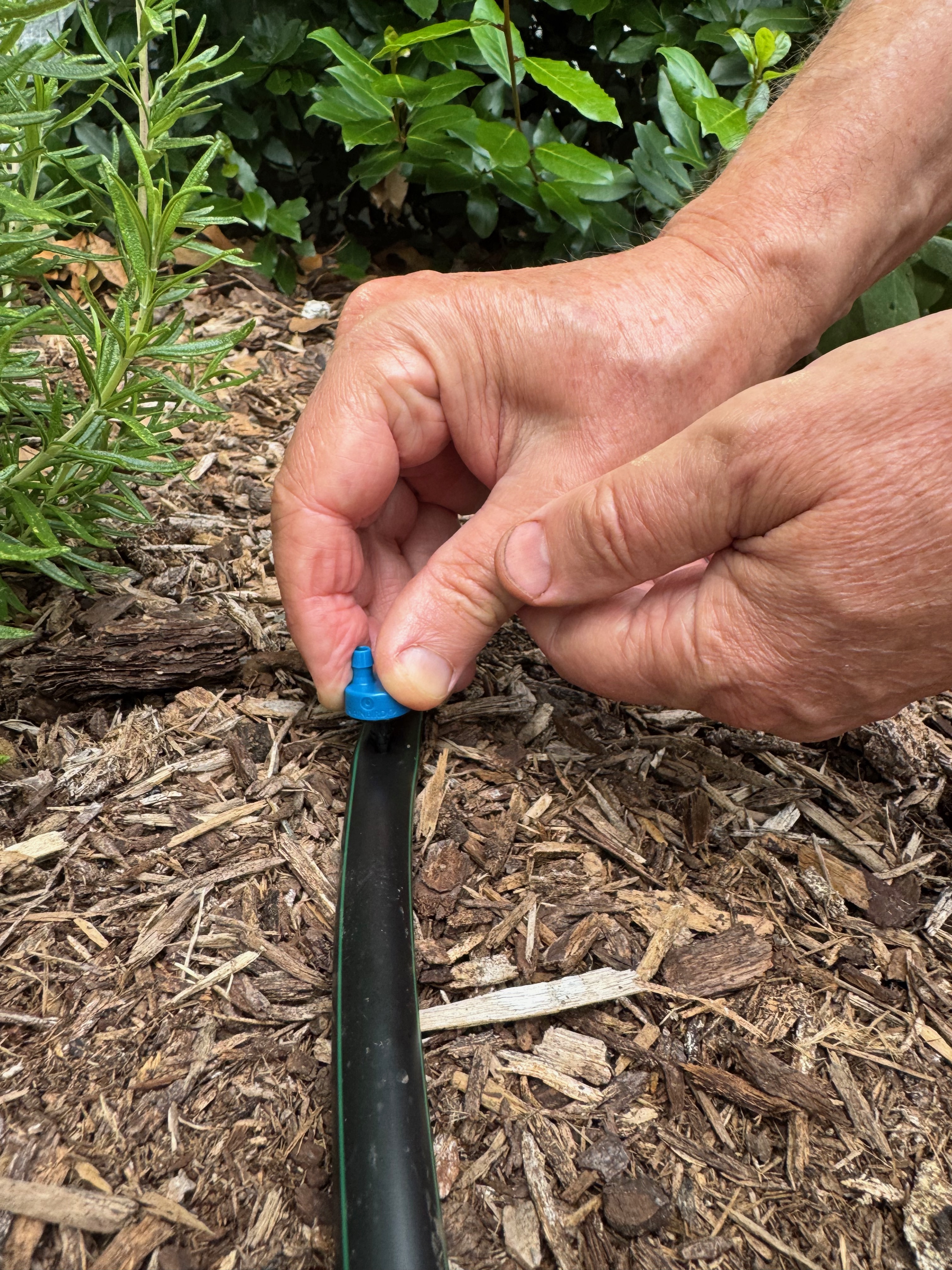 A 0.5 GPH emitter installed on a blank ½” line under a small perennial. (Image credit: Eric Wiebe)